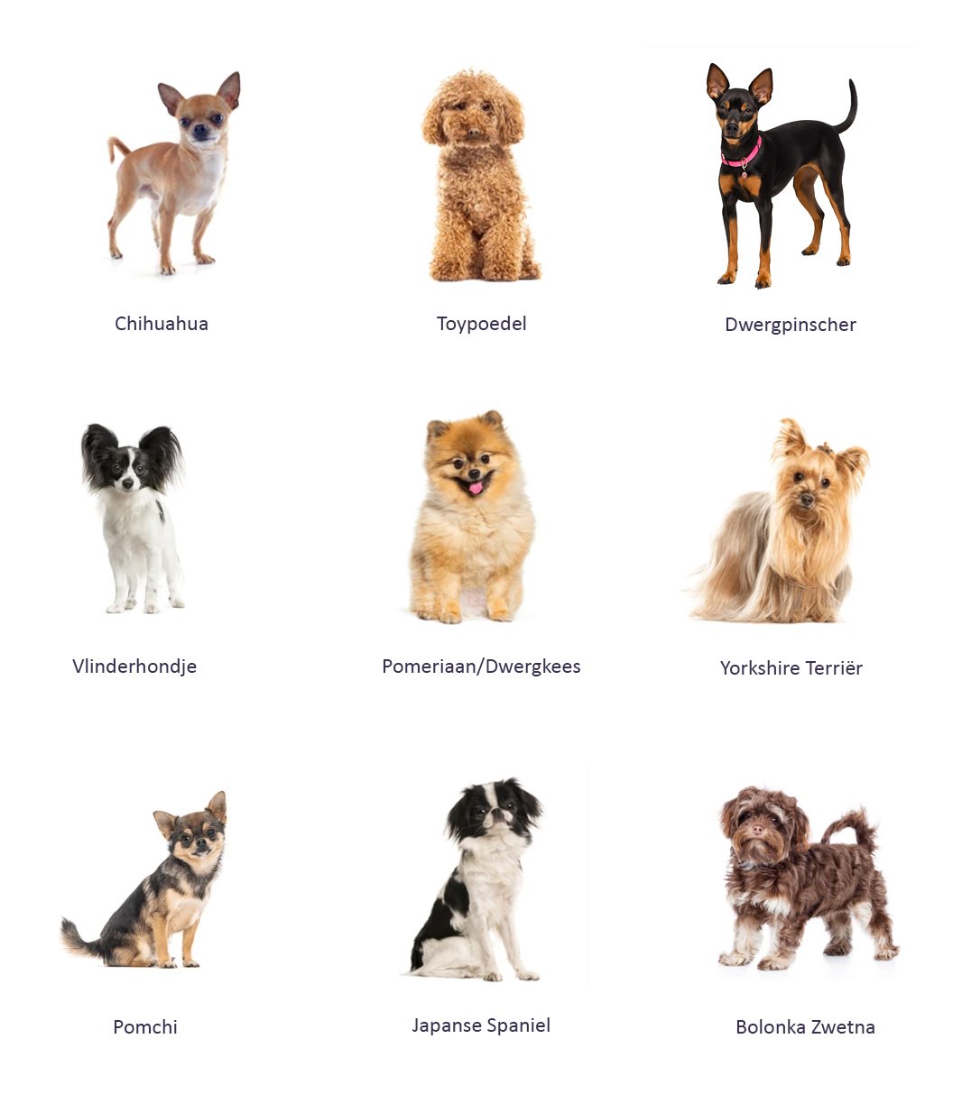 Voorbeelden van minihondjes zijn: