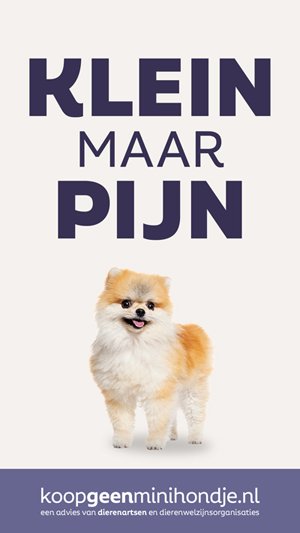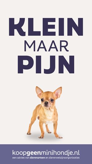 Minihondjes lijden door hun extreme uiterlijk. Draag niet bij aan dit leed. Kies voor een hond die op volwassen leeftijd minstens 3 kilo weegt, en bij voorkeur meer dan 5 kilo.